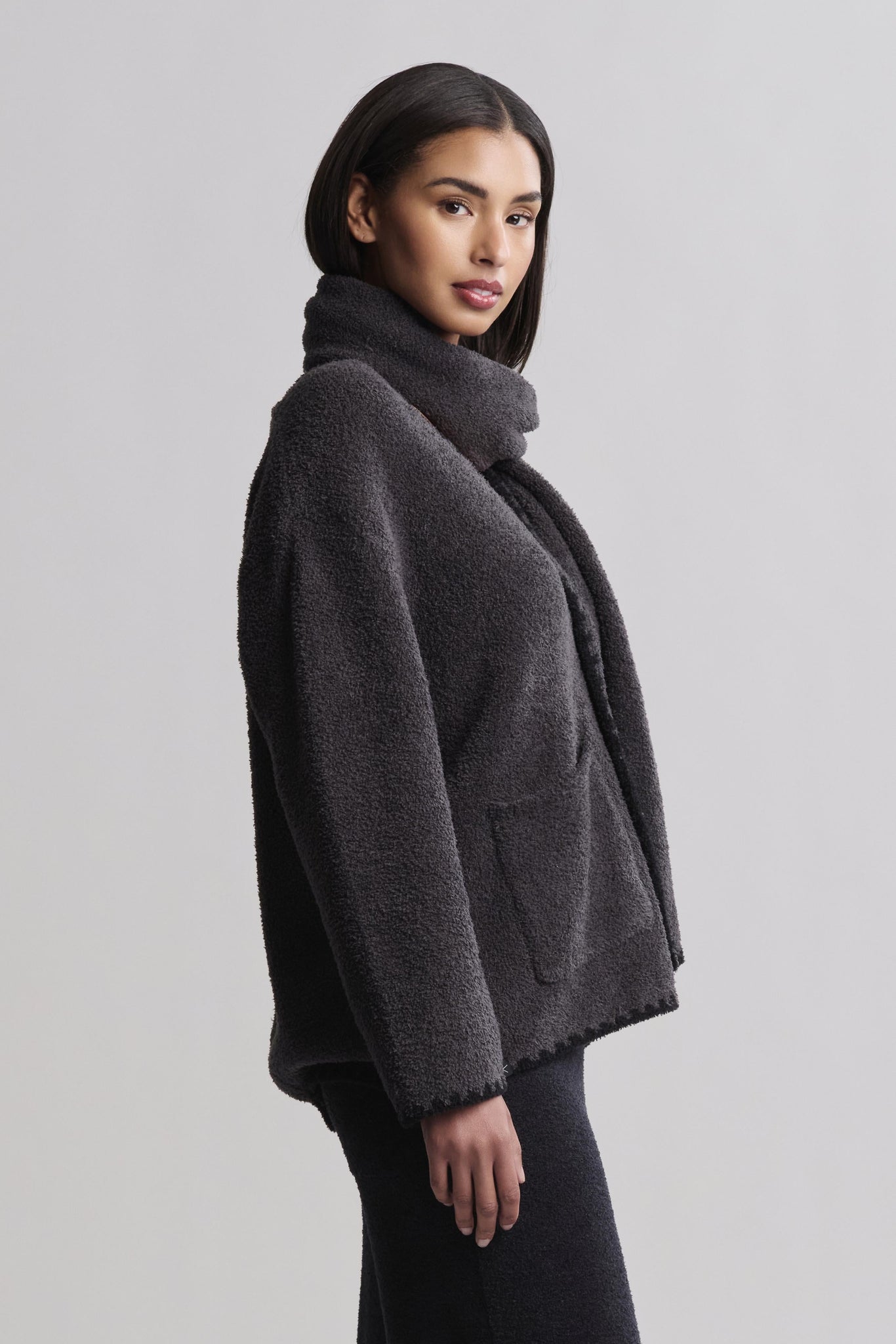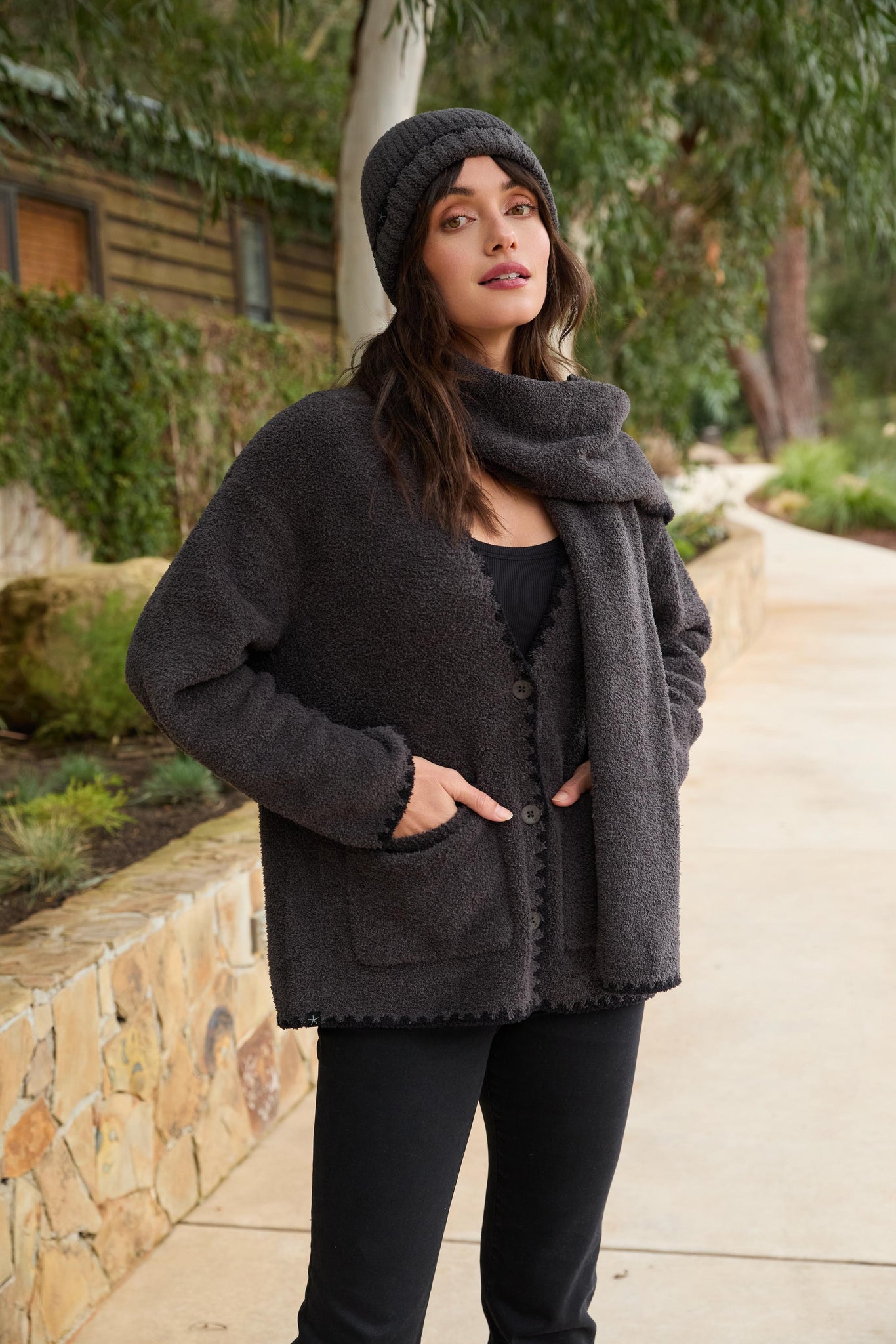 From our Day to Night Collection®, cozy meets clever with our CozyChic® Blanket Stitch Cardigan with Detachable Scarf — a relaxed-fit layering piece designed with both style and versatility in mind. Crafted from our signature ultra-soft knit, this button-front cardigan features a detachable scarf that fastens discreetly at the back neck, letting you switch up your look with ease. Detailed with blanket stitch edging throughout — on the scarf, sleeves, and hem — and finished with front patch pockets, this cardigan offers a modern take on a timeless silhouette. Hitting at the low hip, it's perfect for layering over everything from tees to turtlenecks.