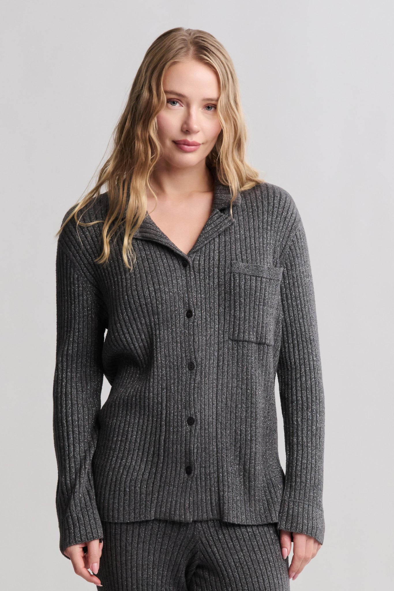 From our Day to Night Collection®, our CozyChic Ultra Lite® Lurex Rib Button Front Shirt blends effortless comfort with a subtle hint of glam and is Where shimmer meets softness. Crafted from a lightweight, all-over rib knit woven with delicate lurex threads, this relaxed-fit button-down catches the light while keeping you cozy. Designed with thoughtful details like a notch collar, a front patch pocket with rib trim, and a pinched seam at the wrist that nods to classic pajama styling, this versatile shirt transitions seamlessly from lounge to street. Finished with shell buttons and a flattering low-hip length, it's your new go-to for elevated ease. Complete the set with our CozyChic Ultra Lite® Lurex Rib Wide Leg Pant.